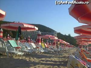 Am plecat spre Albena pe la ora 6 dimineata din Prahova si am ajuns la ora 13,30. am mai oprit pe drum. la ora 14 am primit bratarile si camera foarte frumos amplasata la etj. 1 cu vedere spre mare (se vedea putin printre copaci) in fata o priveliste foarte placuta cu trandafiri, copaci si umbra. In camera curat dar cu 2 minusuri: cele trei gauri in usa de la baie (nu le vad rostul) si patul pliant care scartaia f. rau. In rest curat, prosoape curate schimbate zilnic, spalat pe jos [...] — vezi review [+10 poze][de ARHIVAT în curând]