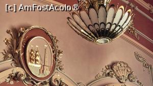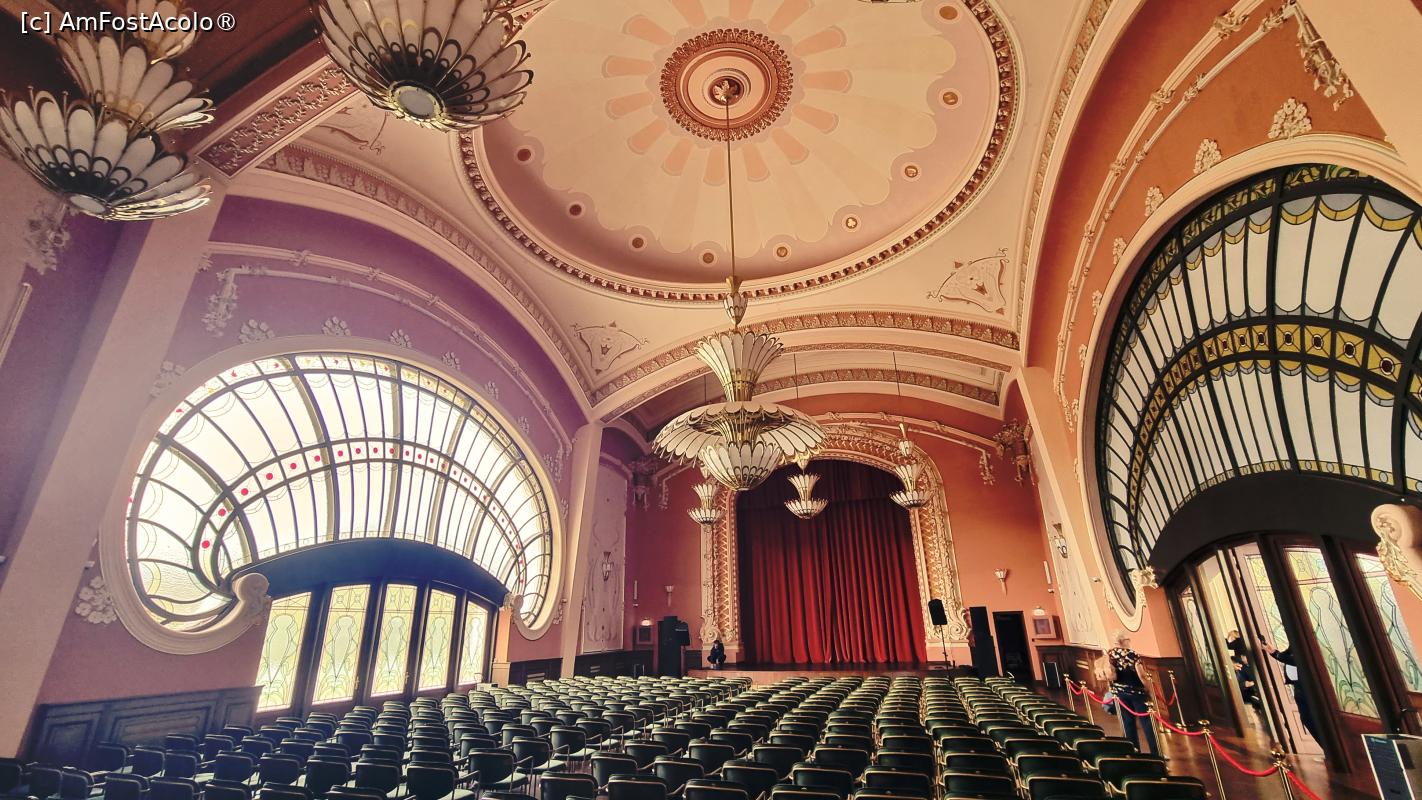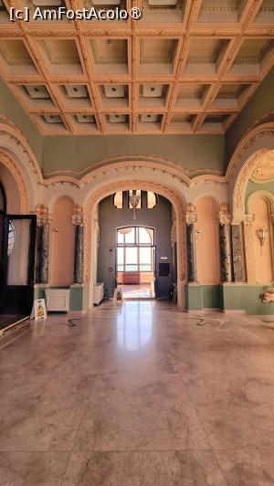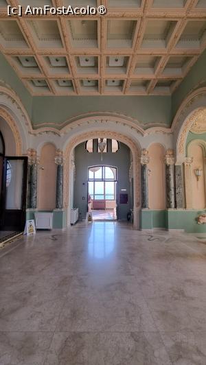 Deci ce găsim în interiorul Cazinoului? După ce se achită biletele de la domnișoarele de la casierie, ne îndreptăm către scara din marmură în 3 rampe și ornamente păstrate de la arhitectul Daniel Renard. Întrăm în sala de bal, devenită acum sală de conferințe/simpozioane/spectacole de muzică clasică, în opinia mea, cea mai spectaculoasă încăpere din Cazino. Admirăm uriașele lustre și aplici care păstrează designul original, vitraliile uriașe în formă de scoică și noua scenă din lemn de pin siberian. Am încercat să stau departe de foițele aurite de la ornamente, simțeam în permanență că am un ochi în ceafă, chiar dacă în spatele meu nu se afla nimeni. Dar sunt o mulțime de camere video.