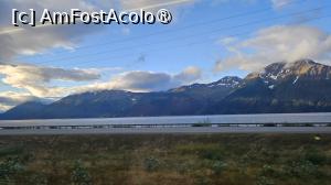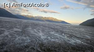 Munții Chugach se aliniază pe orizont, iar trenul începe să urmeze Turnagain Arm, o porțiune de coastă celebră pentru mareele sale extreme. Apa arată când ca o mare, când ca o operă de artă abstractă făcută din noroi și lumină. În această zonă refluxul este foarte puternic.