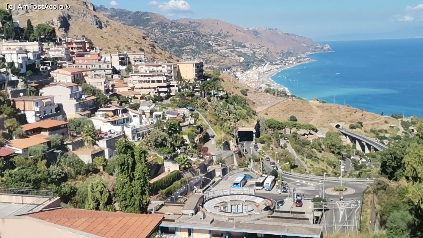 Multa lume afirma pe net ca Taormina este cel mai frumos oras din Sicilia. O adevarata bijuterie turistica. Asadar, am pornit si noi la drum, ca sa vedem daca acest lucru e adevarat. Am pornit pe soseaua ’de coasta’ Catania-Messina, lasandu-ne condusi din nou de ’ghidul nostru turistic atoatestiutor’, pe nume ’Waze’. Am ajuns intr-o parcare mare, aflata la poalele unui orasel situat pe pantele unei coline impadurite, am platit taxa de parcare si apoi am urcat pe niste scari interminabile, dar, de unde aveam o imagine grozava, panoramica, asupra orasului, a marii si, in departare, a unei plaje inguste, si a unei multitudini de case cocotate pe un deal, pana-n varful lui. Ne-am continuat drumul si am ajuns in zona turistica a Taorminei. Ei da! Aceasta parte a orasului, intesata de lume, magazine mici si cochete, strazi inguste (unele in panta), mici taverne frumos dichisite, ascunse dupa palcuri de vegetatie si animate de tot felul de figuri de lut colorate si zambitoare si imbietoare, ne-a dat de inteles ca Taormina este un oras diferit de celelalte orase italiene, sau ca aici, localnicii au un dezvoltat spirit artistic.