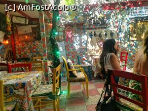 Dupa o plimbare de mai bine de o ora prin oras, ni s-a facut o foame de lup. Asa ca, am coborat spre una din tavernele orasului. Vai, dar nici nu stii pe care s-o alegi. Toate au un oarecare ’vino-ncoa’, ba flori, ba ghirlande vegetale, ba postere colorate, care te atrag nespus. Alegem o terasa cu cateva postere intens colorate, reprezentand orasul. Langa mese, te intampina cateva figurine din lut, si ele, viu colorate. Imi vin in minte spusele unui agent turistic: ’Florile si culorile nu costa multi bani dar pot aduce multi bani’. Aici, ori incotro iti intorci privirea, vezi doar flori si culori. Esti incojurat de ele. Eu comand o pizza, imi zic: ’Ia sa incerc eu ceva ce n-am mai vazut pe la noi’ si aleg o una incarcata cu ’de toate’ plus o bere. Un baiat simpatic ne serveste la masa. Pizza mea e gigantica si de forma dreptunghiulara! Nu stiu daca pot s-o termin. Cred ca mai am nevoie de-o bere.