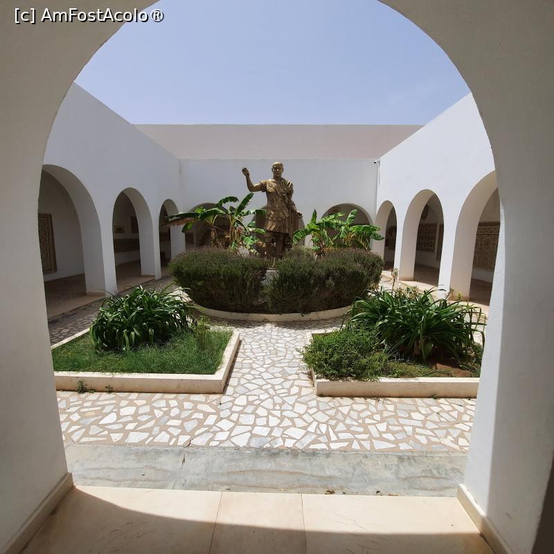 [P33] El Jem, Muzeul Arheologic, Curtea interioară cu Împăratul Traian în miljocul ei, se văd pe lateral sălile cu mozaicuri