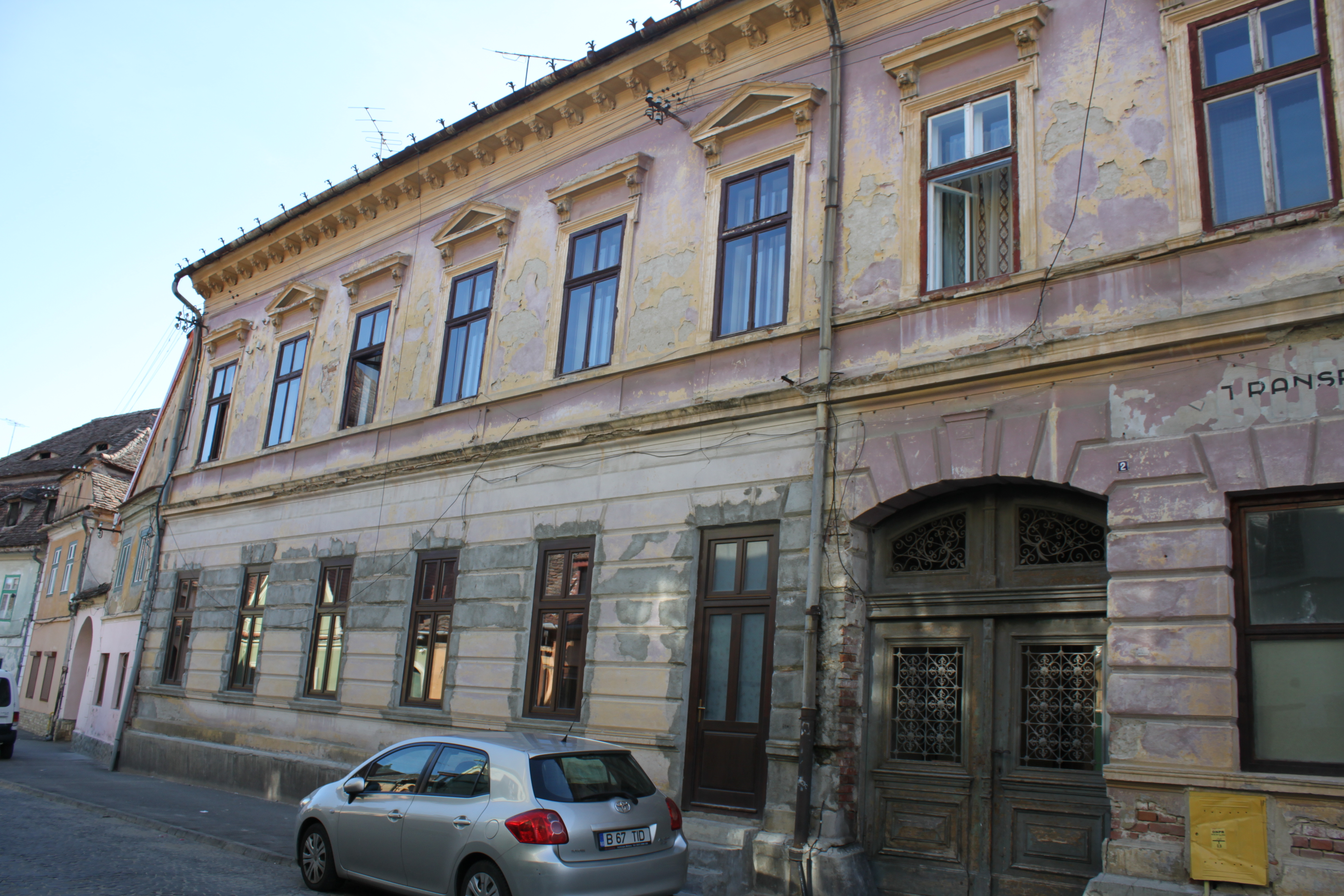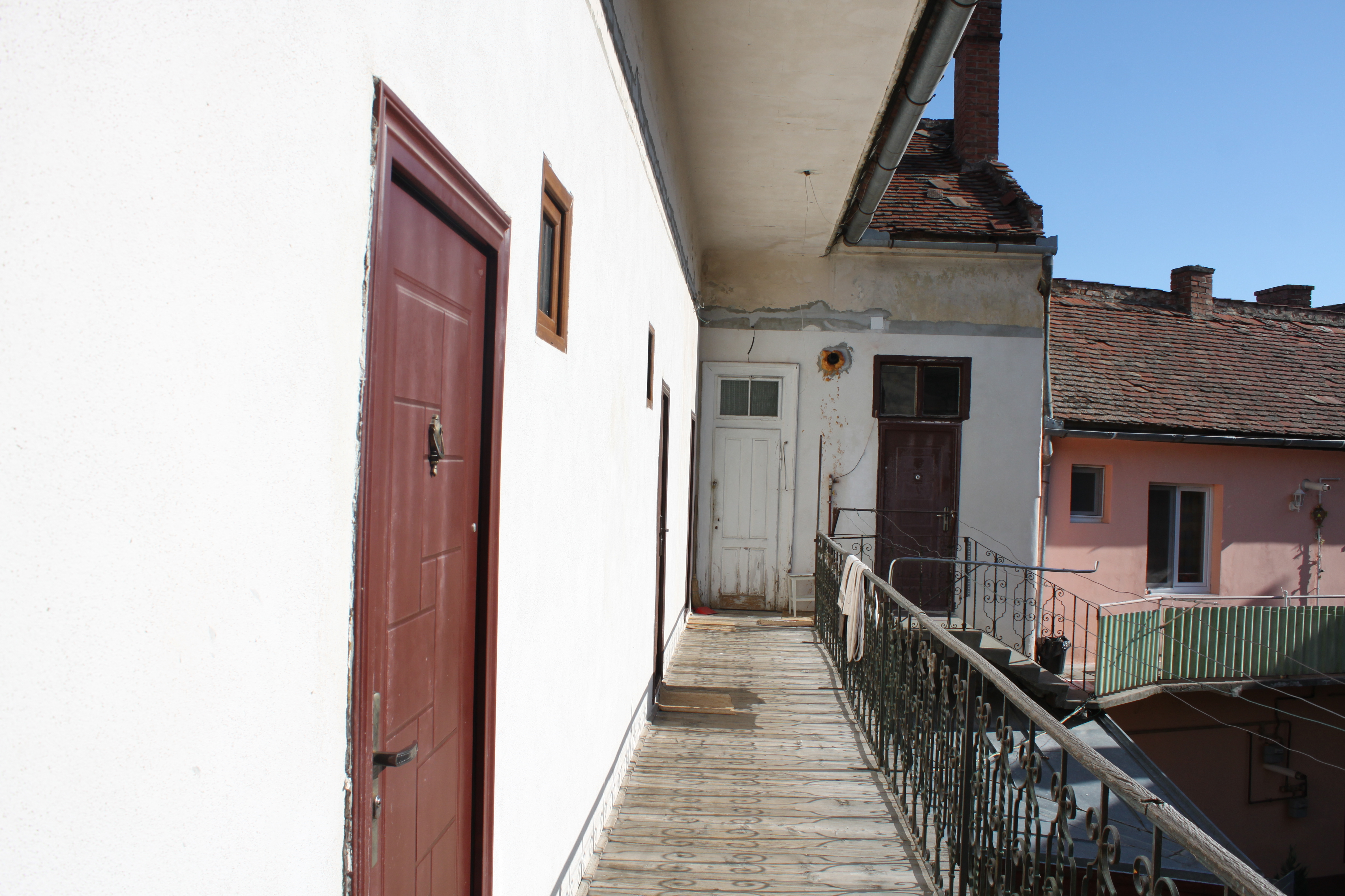 [P05] Exteriorul nerestaurat al clădirii. Garsonierele sunt la etaj, începând cu geamul deschis, spre stânga. Aspectul exterior te dezarmează în primul moment, astfel că interiorul garsonierelor devine o adevărată surpriză.