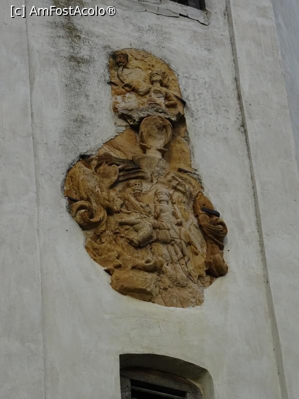 [P16] Relieful de pe turnul clopotniță - doi călăreți purtând în vârful săbiilor capete de turci.
