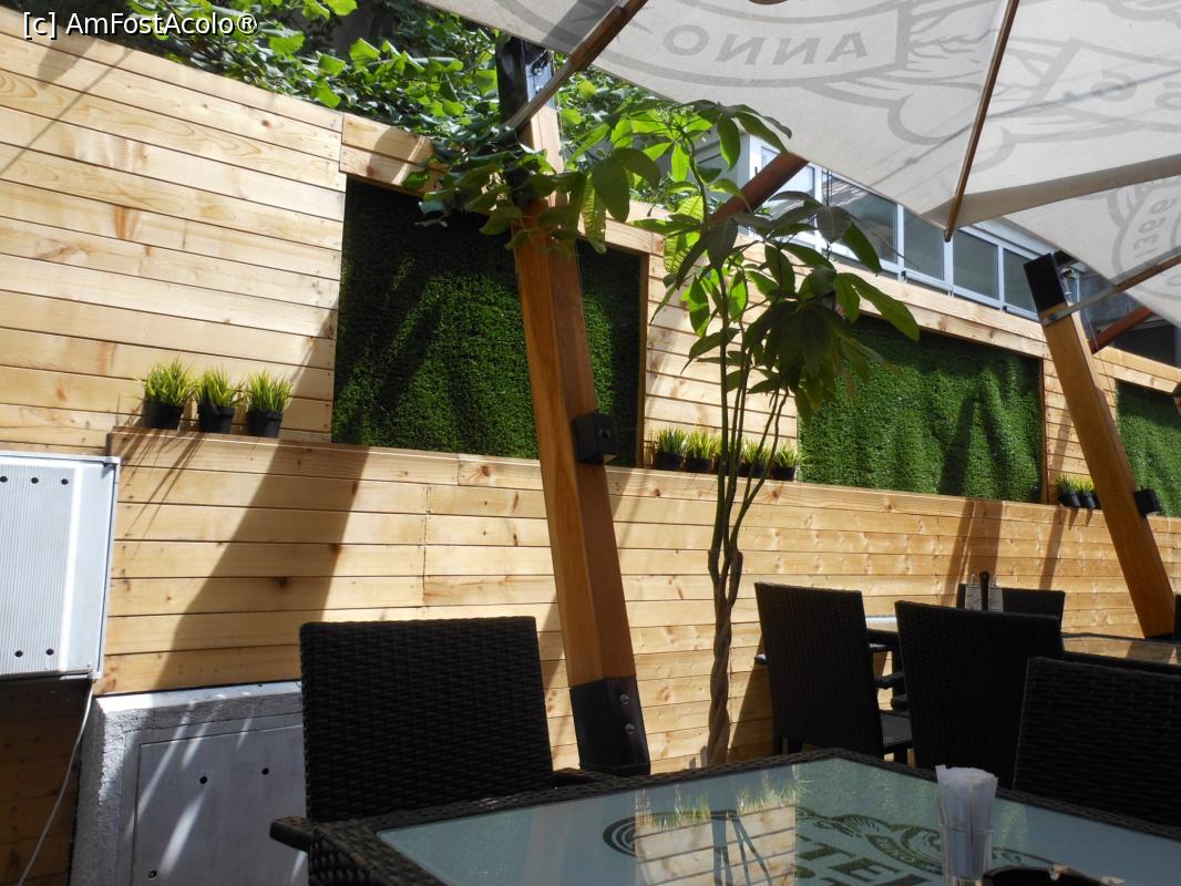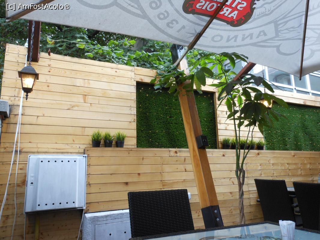 [P03] Bistro Nouveau - Perete din lemn și iarbă artificială mărginind grădina.