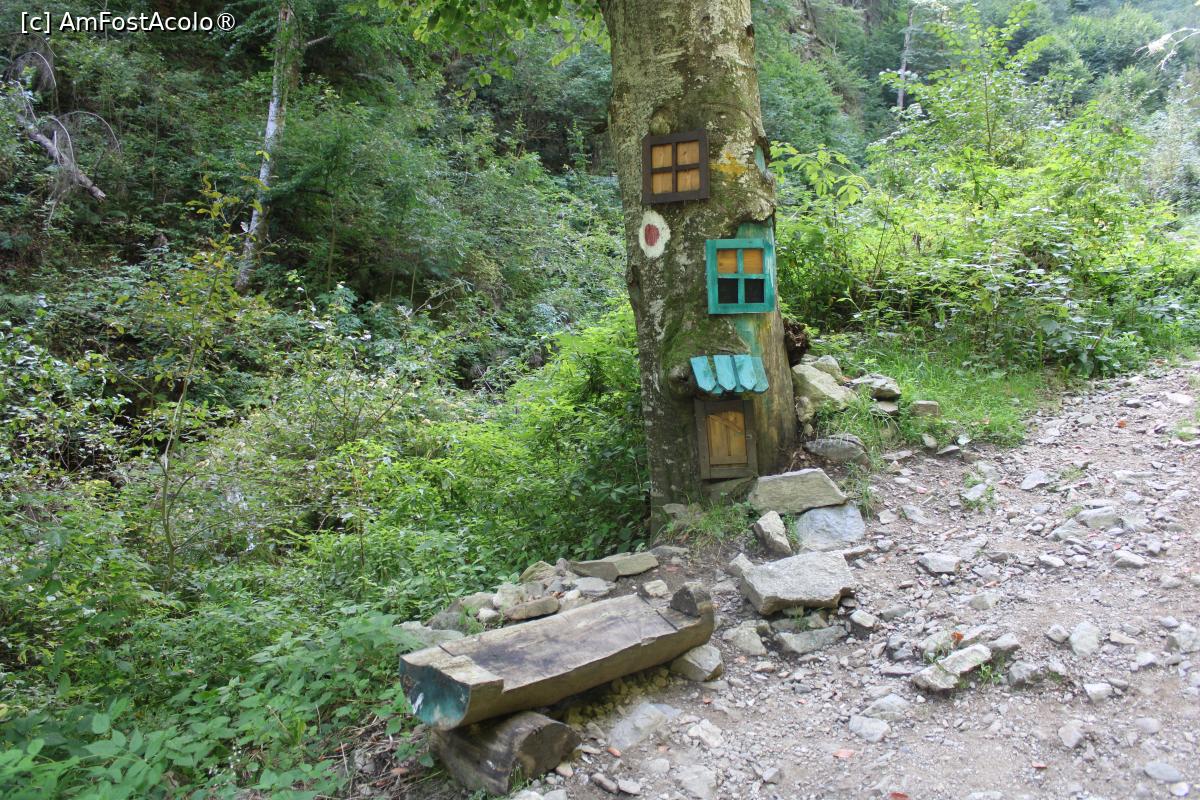 [P13] Poteca turistică spre Cascada Scoruș, Mălaia, Loc de odihnă lângă Marcajul Punct roșu dar și un frumos aranjament pe trunchiul de copac....