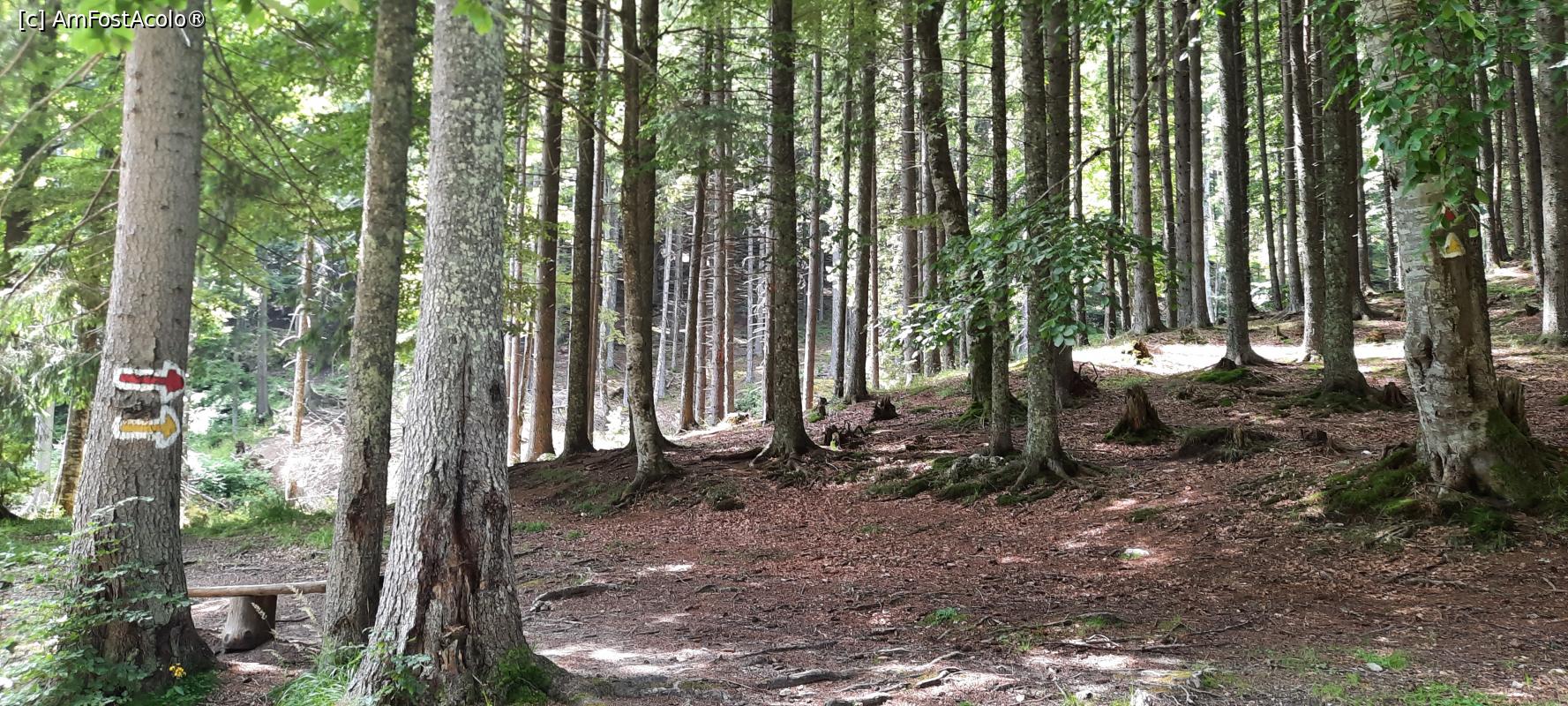 [P34] Parcul Național Piatra Craiului, Trasee turistice marcate cu Semne și Indicatoare, în stânga se vede o bancă pentru popas...