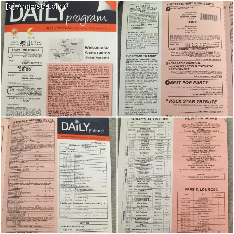 [P01] Programul zilei urmatoare il primeam in fiecare zi dupa pranz, si prezenta o multime de informatii utile pe uscat sau pe vas. Ce voiam sa mai remarc, este ca atunci cand un vas se afla in port, toate centrele comerciale de pe vas erau inchise, se deschideu cum iesea vasul in larg.