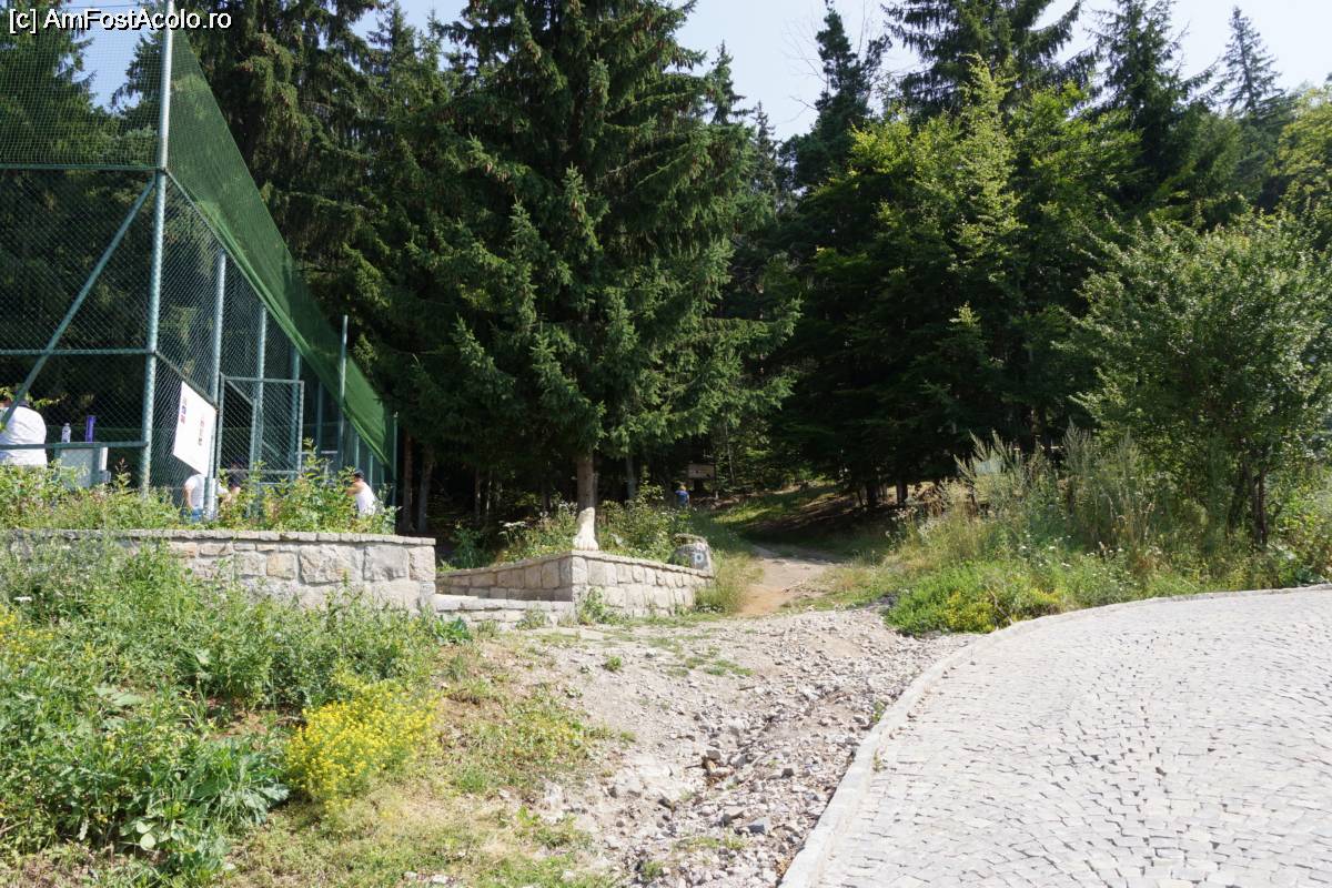 [P01] În stânga este terenul de fotbal. Traseul către peşteră se vede drept înainte.