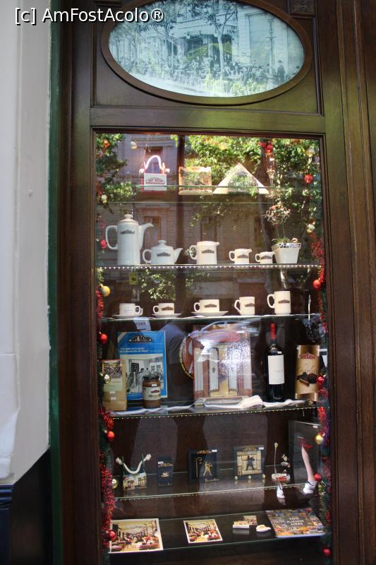 [P32] Buenos Aires, Café Tortoni, vitrină cu amintiri personalizate și prețuri, ceșcuță 8 euro, cutie cu ciocolată 6 bucăți 10 euro...