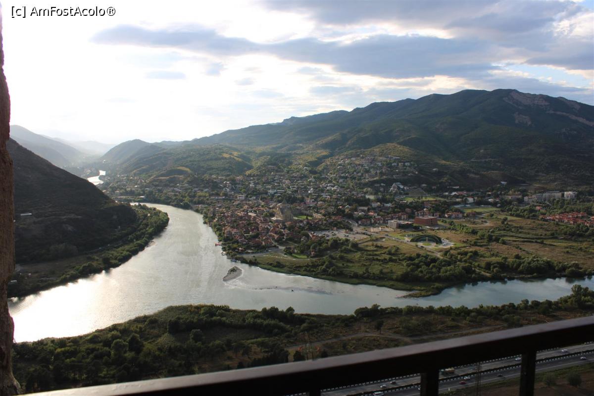 [P49] Mtskheta, Confluența râurilor Mtkvari și Aragvi, cel din dreapta, văzută de la Mănăstirea Jvari și Orașul Sfânt în dreapta