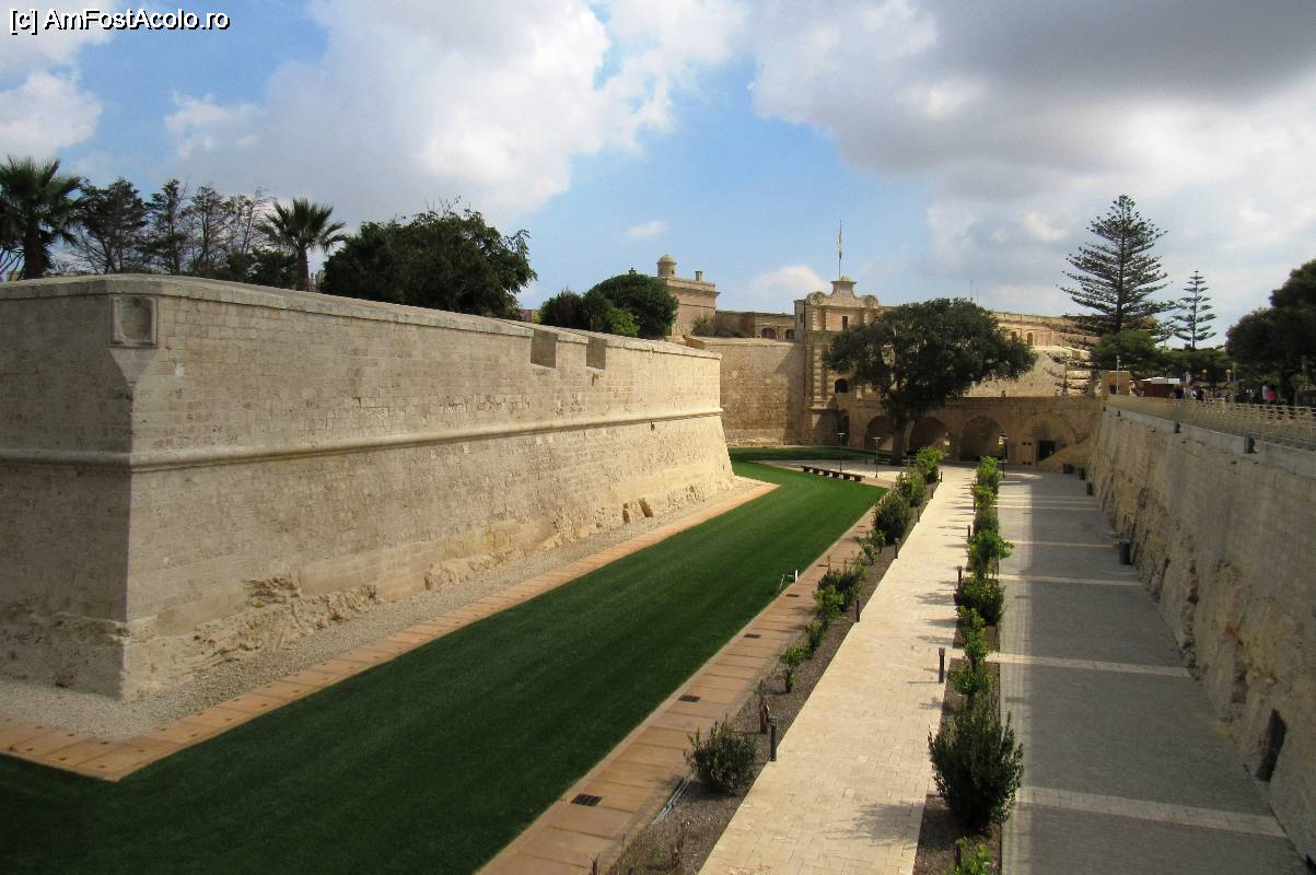 [P03] Mdina era inconjurata cu un sant imens, care pune in evidenta puternicele ziduri de aparare. In dreapta se vede Poarta Mdina si podul de acces in oras
