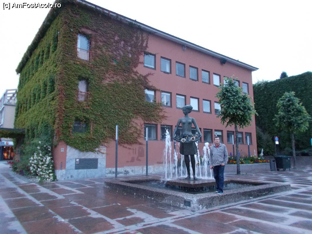[P05] Piaţa din faţa primăriei şi fântâna arteziană având în mijloc fata cu trandafiri.