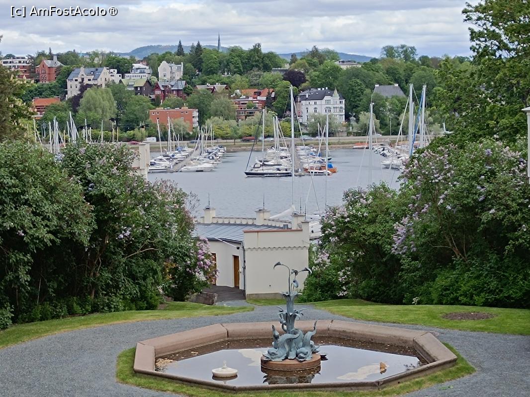 [P34] Oslo, Oscarshall, Vedere spre Port de pe Aleea ce coboară de la Palat, a doua fântână din parc, coborâm la debarcader...