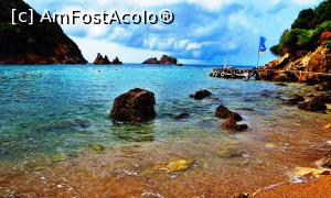[P17] Turiști la plajă/bălăceală în Golful Agios Spyridon (punctul 5.6), singura plajă numai cu nisip din Paleokastritsa. În spate, în dreapta, este Acvariul (punctul 6.10), având vis-a-vis o bisericuță cu clopotniță în stil corfiot. Pe dealul din stânga este Mănăstirea Paleokastrista (6.3.)