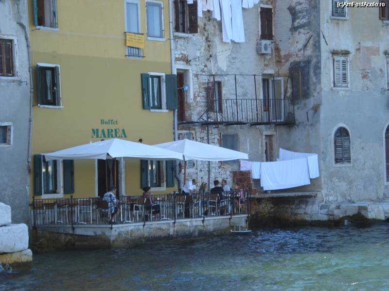 [P22] Cladiri vechi ce par ca se ineaca in mare, peisaj din Rovinj, cu terase in "buza" marii