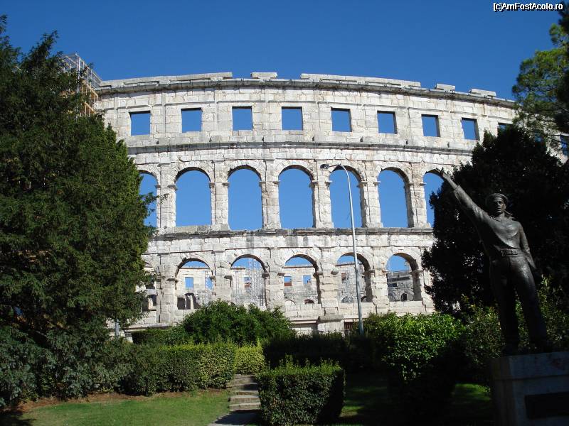 [P09] Amfiteatrul Roman, emblema Polei, cu statuia unui patizan in dreapta imaginii