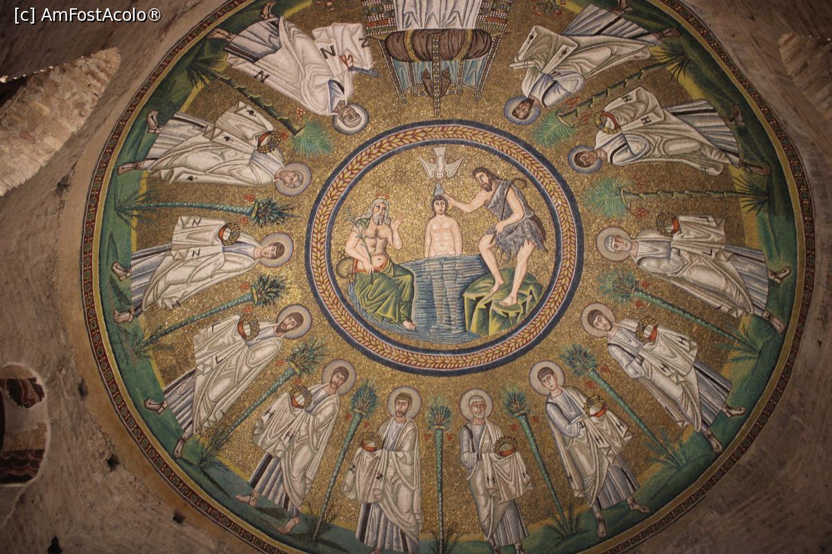 [P20] Ravenna, Battistero degli Ariani, Cupola, Botezul lui Hristos cu Ioan Botezătorul, personificarea râului Iordan și porumbelul Duhului Sfânt