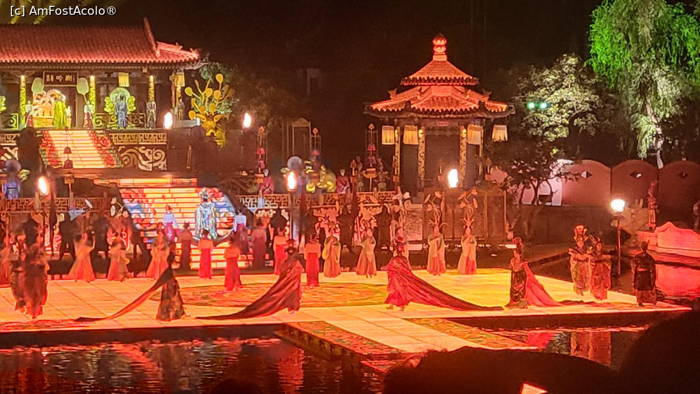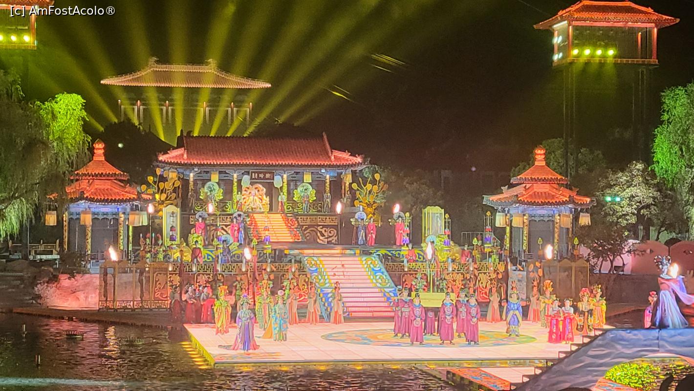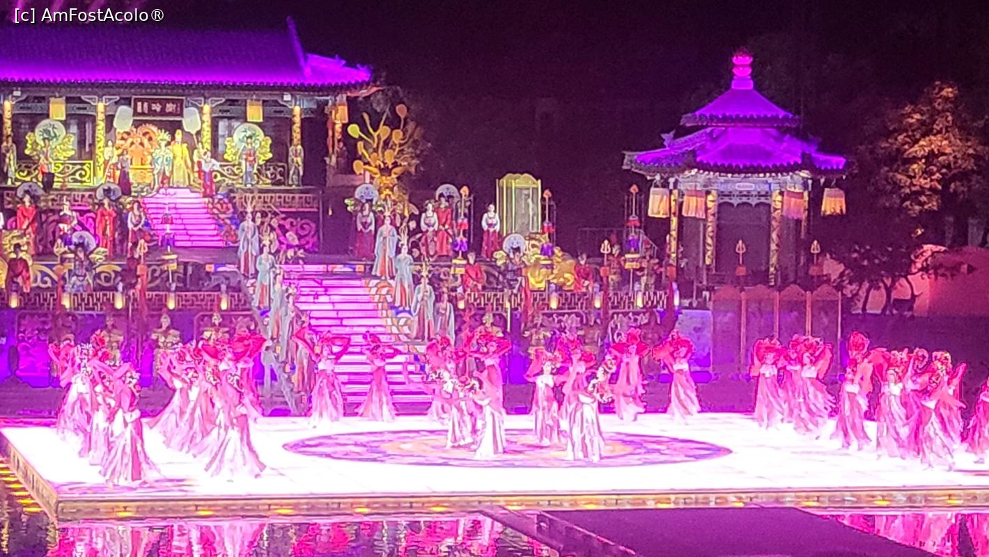 [P07] Sunt in total 10 scene, amplasate pe diferite nivele, in jurul lacului Jiulong, cu mii de lumini sclipitoare ce lumineaza muntele Lishan din fundal. Cateva sute de dansatori isi interpreteaza rolurile, sub efectele scenice elaborate, fantani arteziene, artificii si proiectii 3D, spectacolul fiind atat de real incat am simtit mirosul parfumului consoartei Yang atunci cand se scalda pe scena, caldura flacarilor simbolizand razboiul si burnita aparuta dupa moartea consoartei Yang.