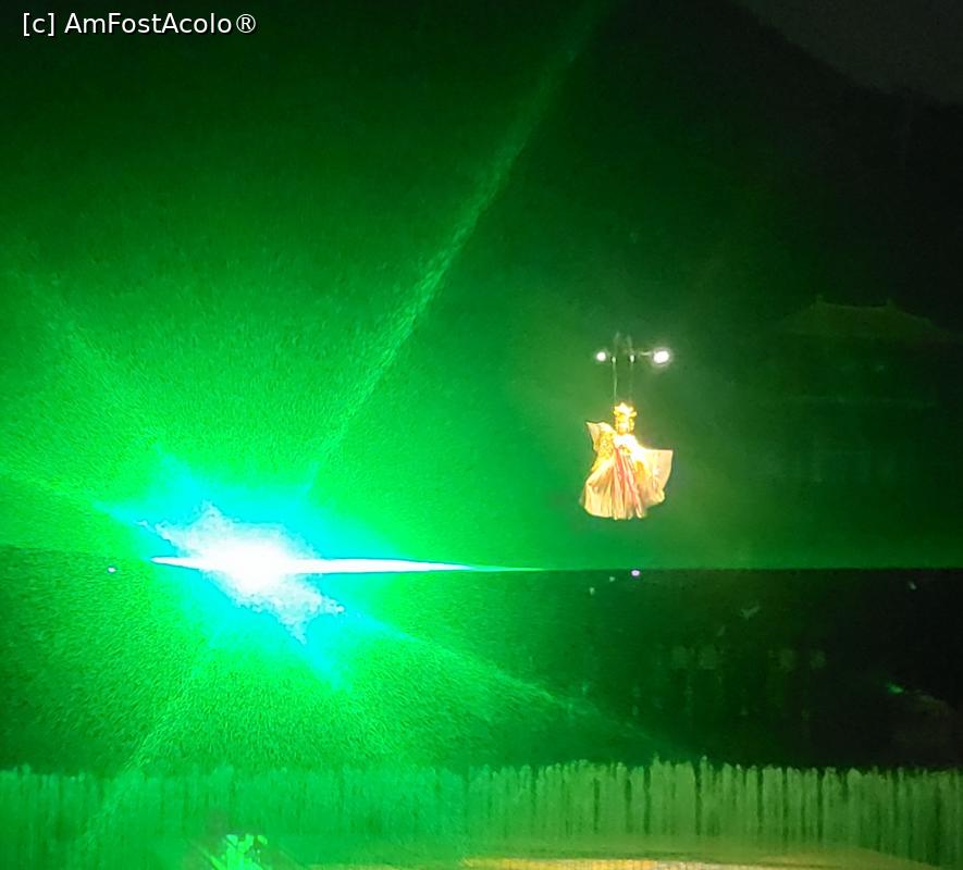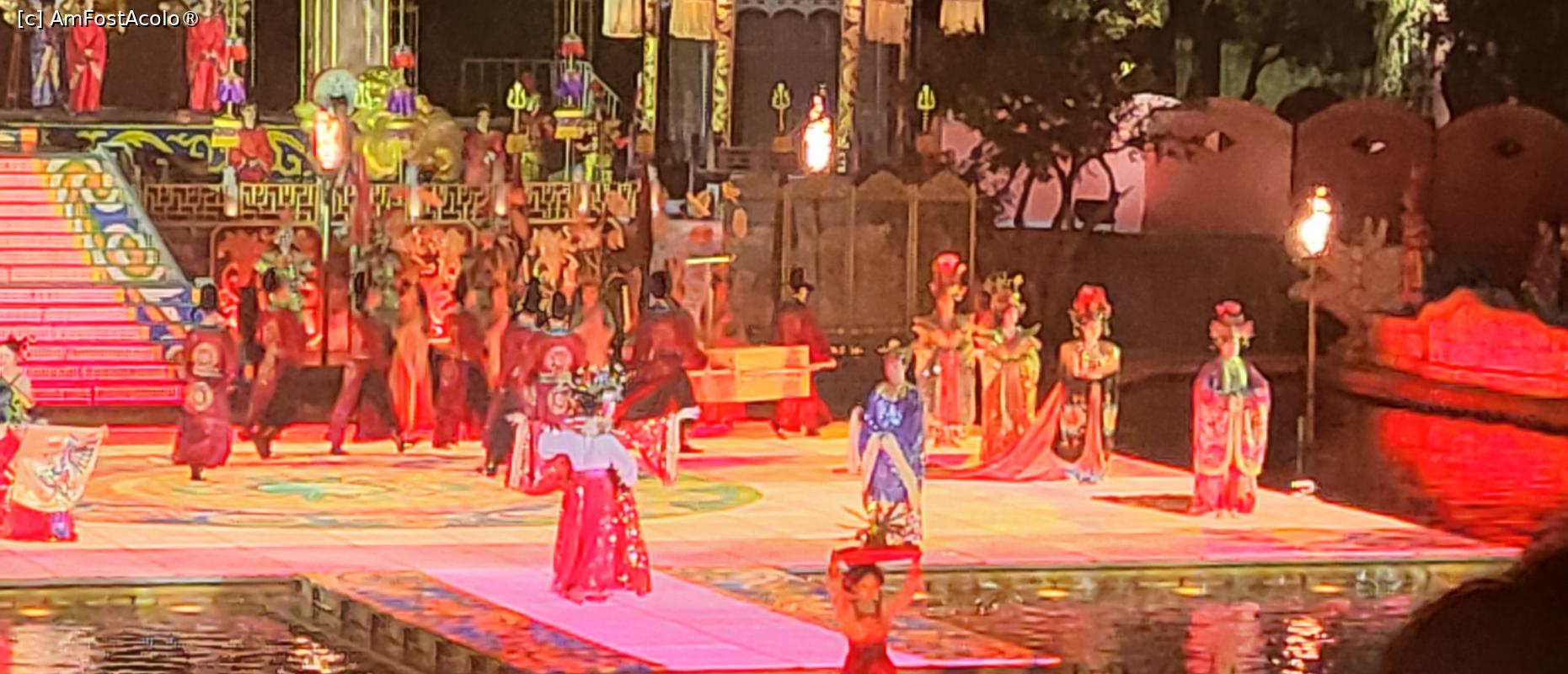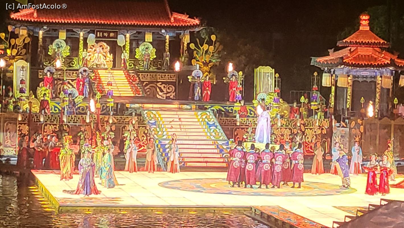 [P07] Sunt in total 10 scene, amplasate pe diferite nivele, in jurul lacului Jiulong, cu mii de lumini sclipitoare ce lumineaza muntele Lishan din fundal. Cateva sute de dansatori isi interpreteaza rolurile, sub efectele scenice elaborate, fantani arteziene, artificii si proiectii 3D, spectacolul fiind atat de real incat am simtit mirosul parfumului consoartei Yang atunci cand se scalda pe scena, caldura flacarilor simbolizand razboiul si burnita aparuta dupa moartea consoartei Yang.