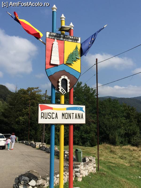 [P01] Am ajuns la Rusca Montana. Se vede parcarea unde puteti opri pentru vizitarea Monumentului Turismului.
