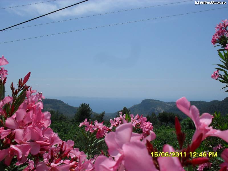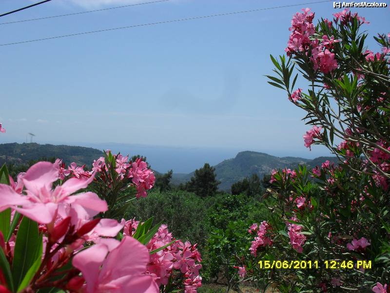 [P42] sus de pe munte, se zareste marea printre flori roz de leandru, nu-i asa ca va ganditi acum la Sithonia?