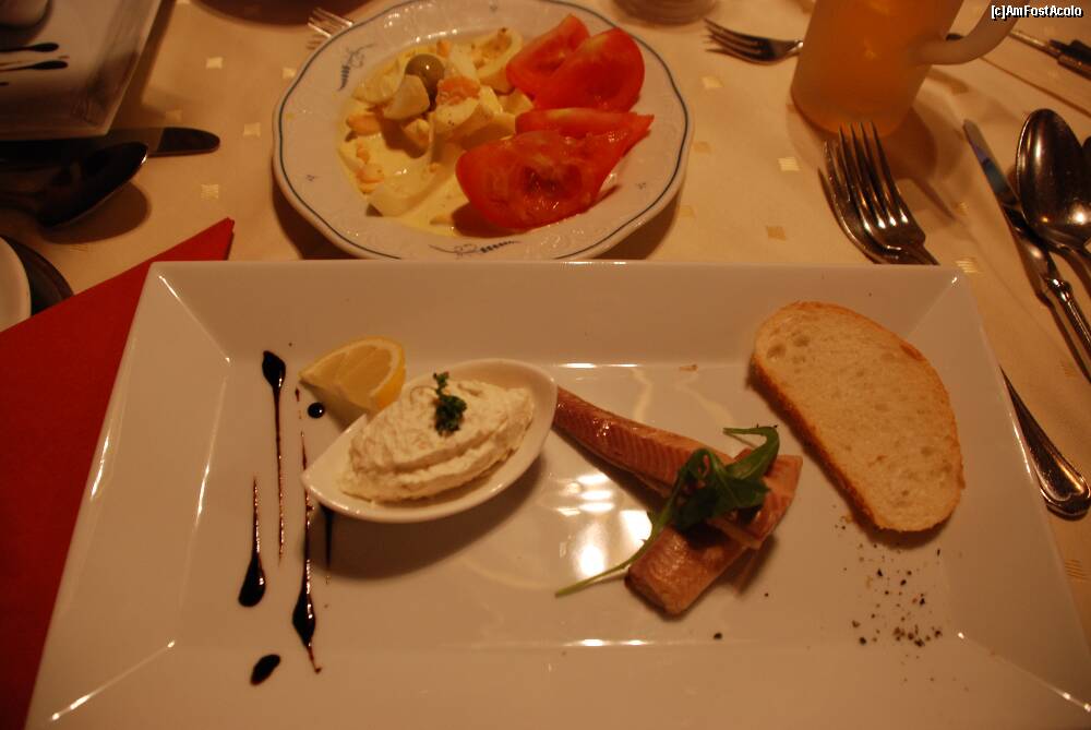 [P17] Aperitiv la cina , pensiunea Zeferer . Pastrav afumat cu crema de branza amestecat cu frisca .