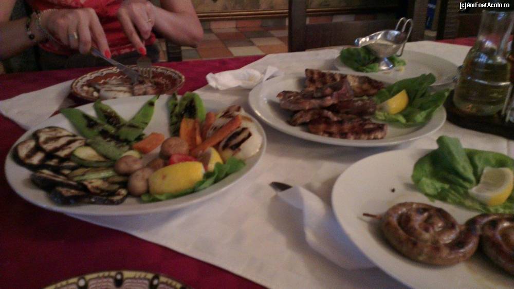 [P14] Seara dupa o plimbare prin fosta capitala a bulgariei, Veliko Tarnovo, am luat cina la restaurantul locatiei. in stanga vedeti legumele la gratar, extrem de gustoase, in mijloc coastele de porc la gratar si in dreapta carnatii de casa de care va spuneam. toate acestea au mers de minune cu un vin rosu local dar si cu o bere bulgareasca. Oferta este extrem de variata. si mancare si bautura pentru toate gusturile.