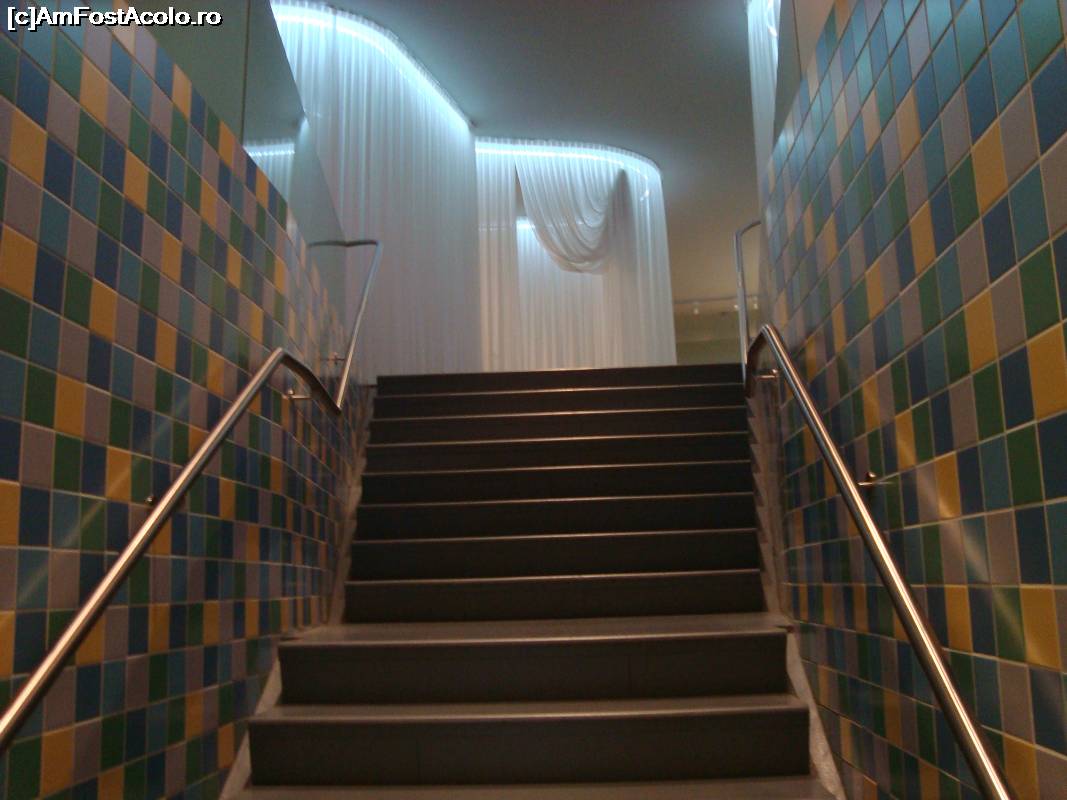 [P23] Sus pe scari apar perdele albe ce ascund exponatele, legate de expozitia... 400 de ani de viata universitara