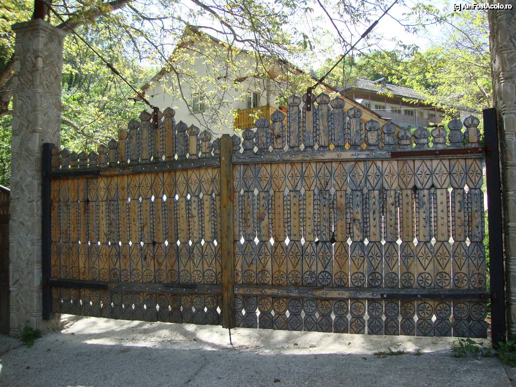 [P08] Poartă realizată din lemn sculptat, aflată lângă clopotniță.