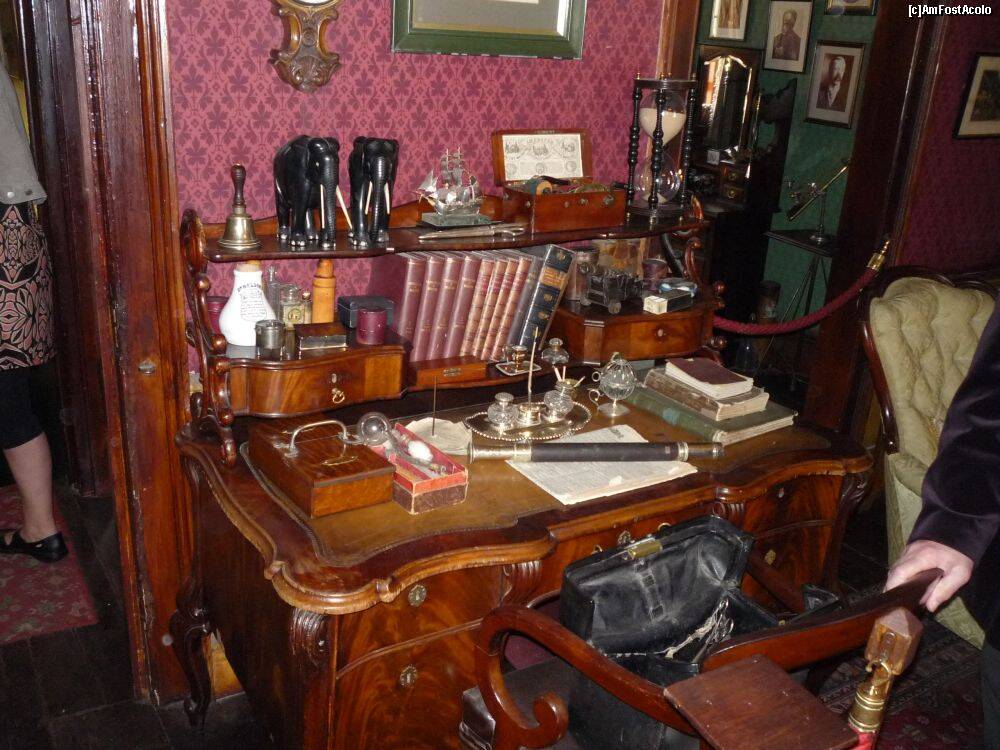 [P04] Muzeul Sherlock Holmes - biroul lui Sherlock, pe fotoliu este trusa medicală a bunului dr. Watson.