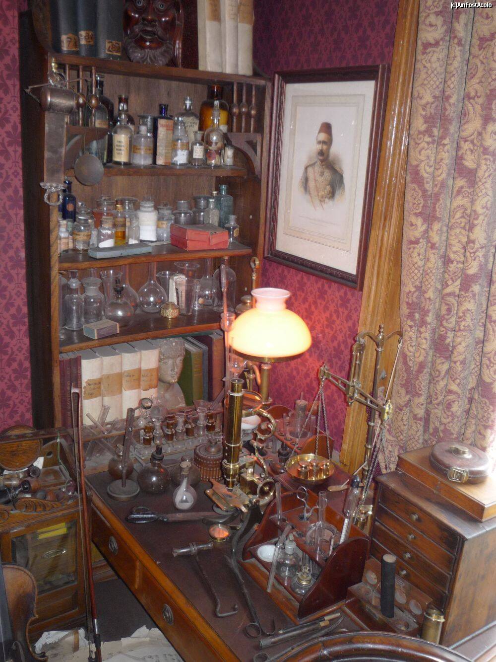 [P05] Muzeul Sherlock Holmes - masa de laborator şi aparatura cu substanţele necesare analizelor.