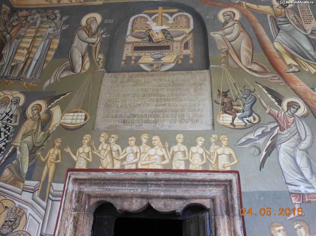 [P12] Herăşti - Pisania şi pictura murală de deasupra intrării în biserică.