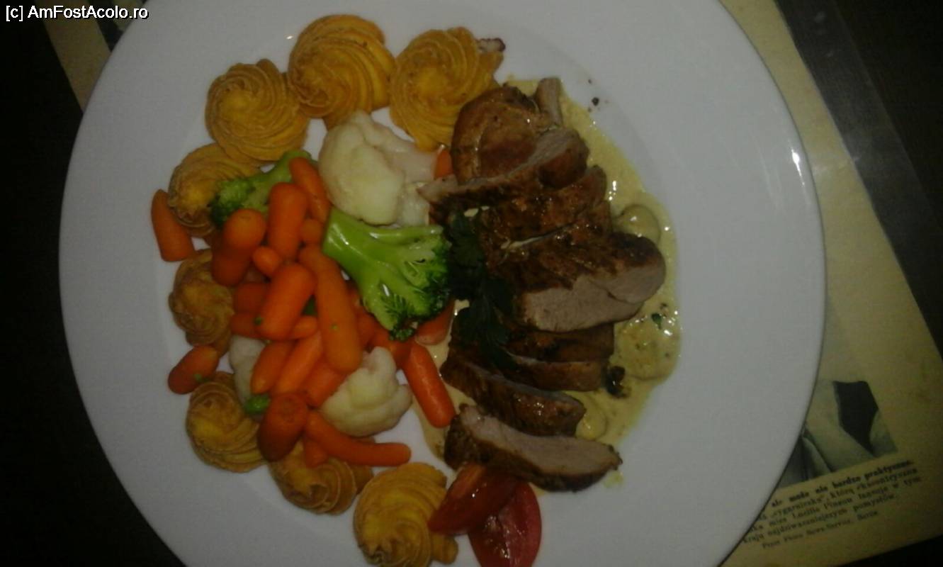 [P19] friptura de vita cu legume la gratar pentru Bogdan cu farfuria asezata pe un ziar...