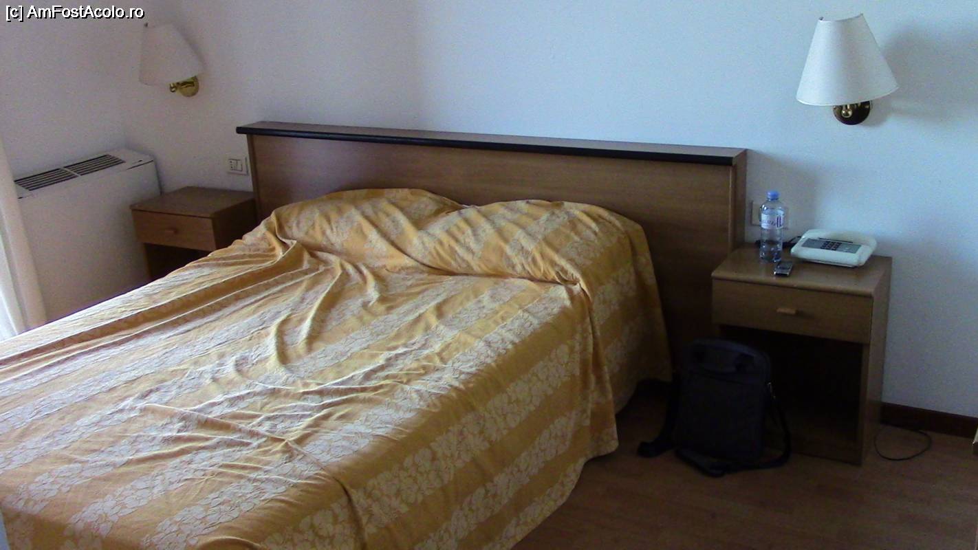 [P07] Patul dublu aranjat cat de cat dupa o noapte de somn. Langa sunt noptierele (una are telefonul camerei), iar aplicele sunt prinse in perete.