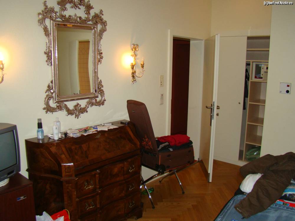[P01] Camera dubla, superior, varianta mica. Patul suplimentar este un fotoliu extensibil, confortabila, dar pentru copii (sau persoane mai scunde). Fereastra da in piata unde este Votivkirche. Se observa mobilierul.