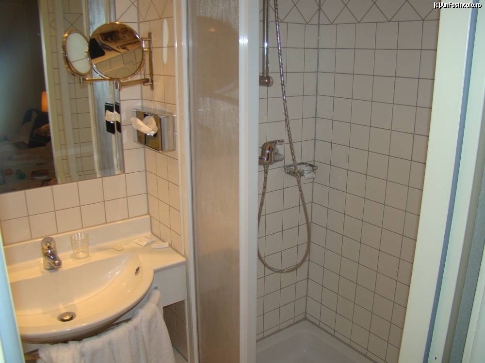 [P03] Baia de la o camera mica. Din pacate, nu are legatura cu clasificarea camerei, poti avea camera standard cu baie mare, cu cada, sau camera superior, cu baie mica, cu dus. Diferenta o face, presupun, privelistea.