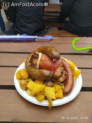 ![[P21] Prânzul nostru: doi cârnați, cel mai închis nu ne-a prea plăcut, cred că era un fel de caltaboș. Cel roșcat a fost bun. Un rasol de porc la cuptor cu cartofi și o lipie aflată dedesubt plus niste muștar care nu a mai încăput în imagine. Preț? 1700 HUF, adică până în 5 euro » foto by mihai007
