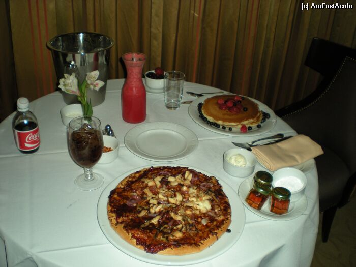 [P2x] Room Service la Venetian. Destul de scump (80$+). BBQ Pizza, Clatite cu fructe de padure, suc de pepene. Comanda ajunge in cel putin 35 de minute. Au multe taxe incluse, nu dati tipsuri imense (gen 20$).