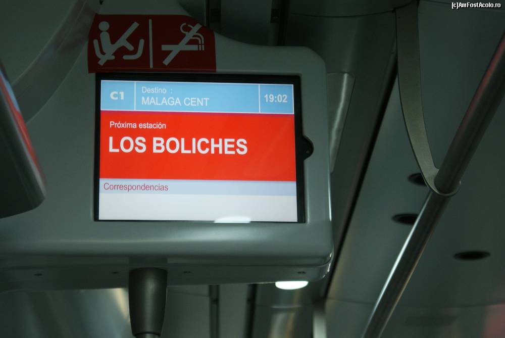 [P18] În tren, din loc în loc, se află ecrane LCD, pe care se afişează destinaţia (Malaga Centro), ora de sosire 19:02) şi staţia care urmează (Los Boliches)