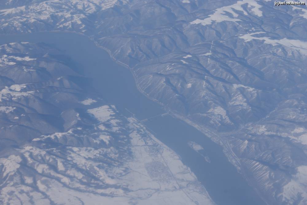 [P02] Dunărea, văzută din avion. Se pot observa barajul de la Porţile de Fier şi insula Şimian