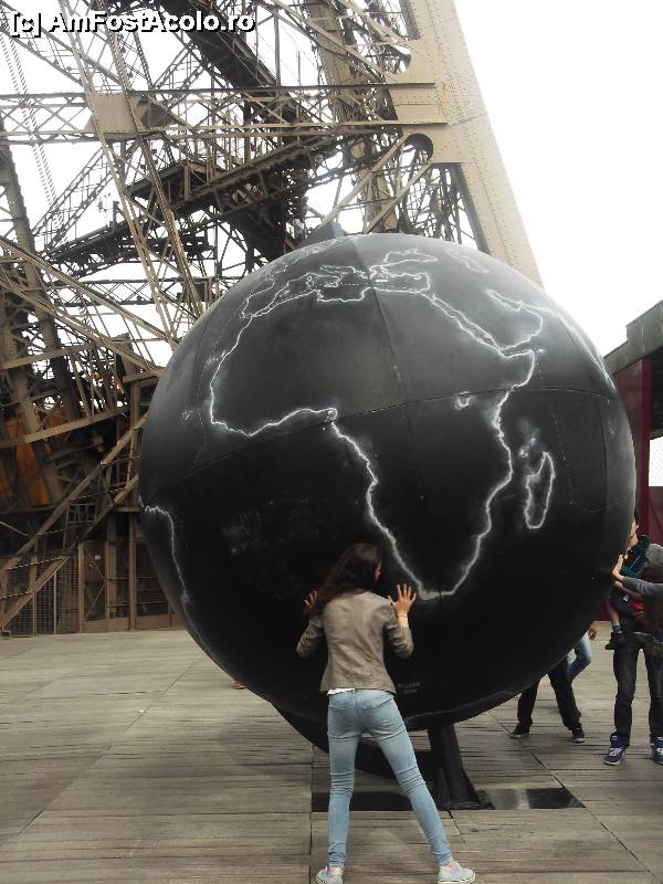 [P16] La etajul unu al turnului Eiffel, locul de relaxare: un glob pământesc mobil cu care turiștii se jucau, învârtindu-l. Tot la acest etaj se găsea un snack bar unde cei grăbiți își puteau astâmpăra foamea.