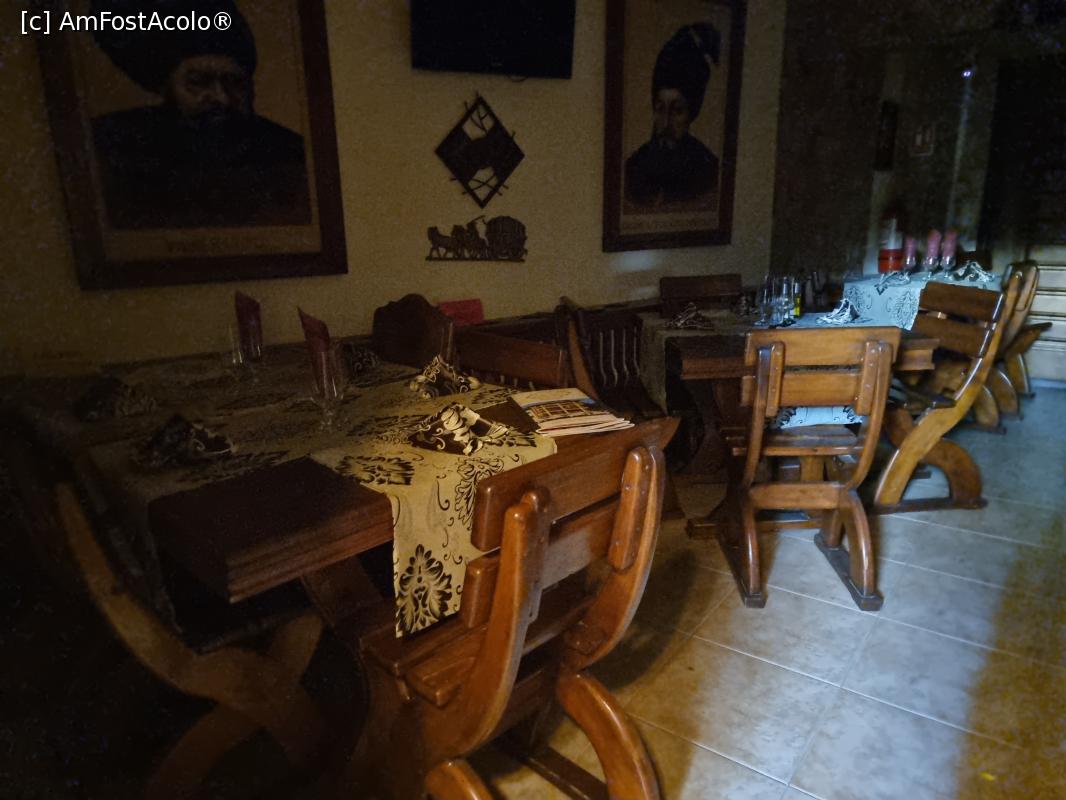 ![[P23] Mese si scaune din lemn masiv, grinzi placate cu lambriuri, tablori cu domnitori, sabii de panoplie si armura completa in restaurant, la etaj » foto by silvia tudoran