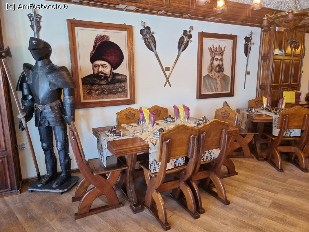 [P23] Mese si scaune din lemn masiv, grinzi placate cu lambriuri, tablori cu domnitori, sabii de panoplie si armura completa in restaurant, la etaj