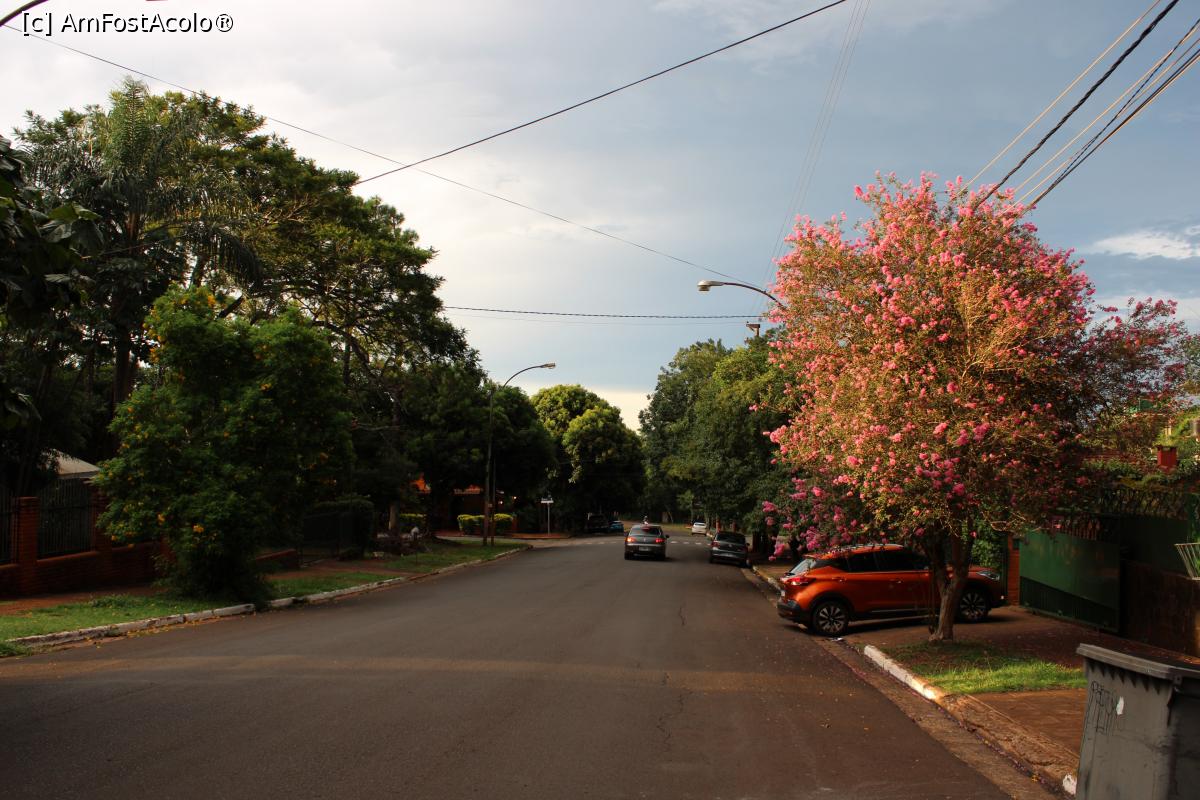 [P02] Puerto de Iguazú, Plimbare spre Restaurante y Parrilla Rafa pe străzi cu pomi, flori și multă verdeață