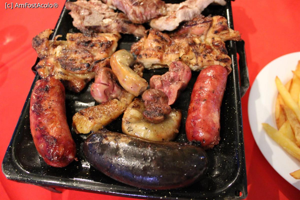 [P08] 8 IMG_2543 Puerto Iguazú, Res y Parrilla Rafa, Grătarul pentru două persoane, În prim plan specialitățile argentiniene cârnații Criollos și Morcilla Dulce, cel negru, rinichi...