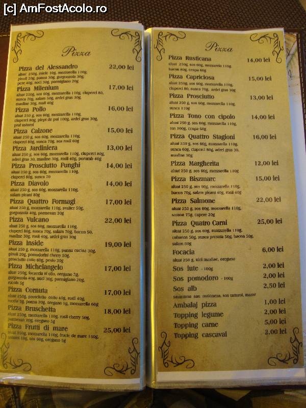 [P22] Restaurantul Milenium - sortimente de pizza. Noi am mâncat pizza Milenium și a fost foarte bună.