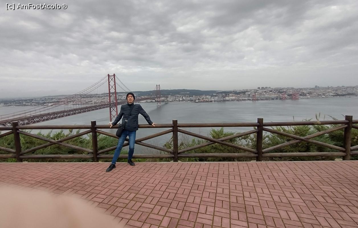 Subsemnatul la Christo Rei. În spate se deschide o superbă panoramă care cuprinde pe fundal Podul 25 Aprilie, fluviul Tejo și o parte din Lisabona.