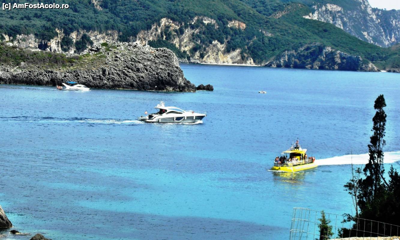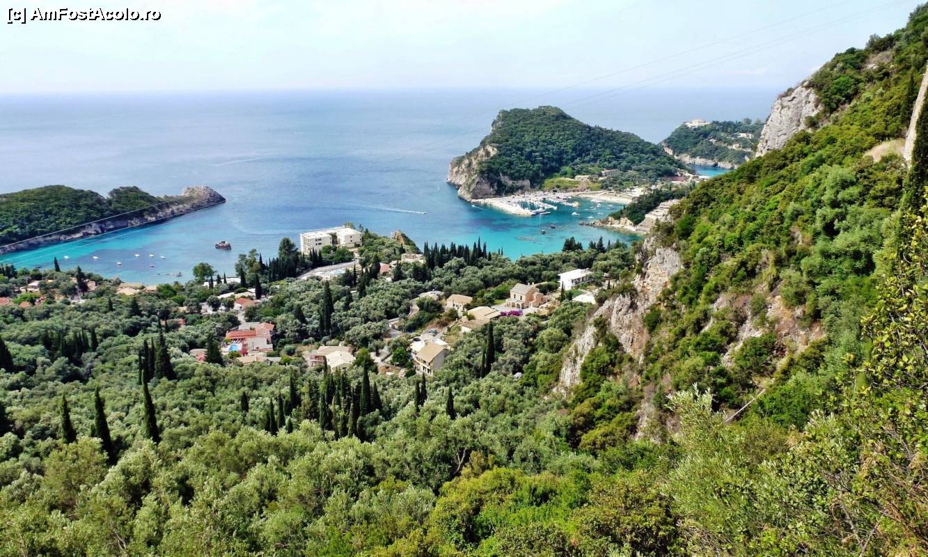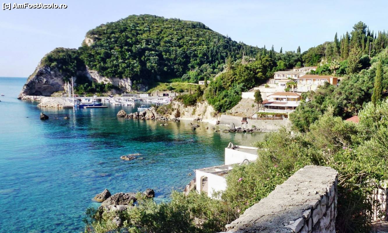[P01] Vedere parţială asupra staţiunii Paleokastritsa. În centrul imaginii se vede bine portul turistic, iar la dreapta lui, un colţ din Villa Dini. Fotografie făcută de pe "Marele tur al staţiunii", prezentat în text