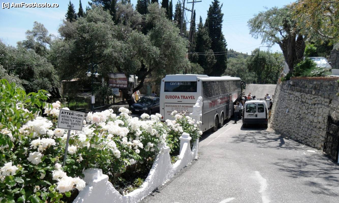 [P04] Turiştii români coboară din autocar la Vila Dini (aflată de cealaltă parte a străzii, în partea stângă a imaginii)